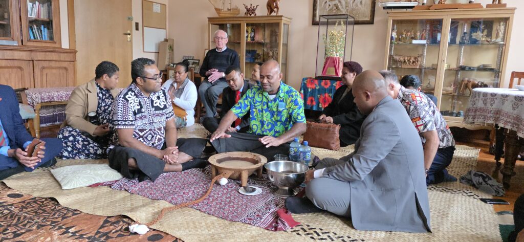 Fr Pat Colgan, Fr JJ Ryan and I were the Columbans here that served in Fiji. Helped by our ex Lay Missionary Save Momo and his cousin Victor Parr we prepared a room in Dalgan with Fijian mats, Masi and other Fijian artefacts that were available in Dalgan for the Fijian yagona ceremony of welcome which was appropriately presented to our chief guests.