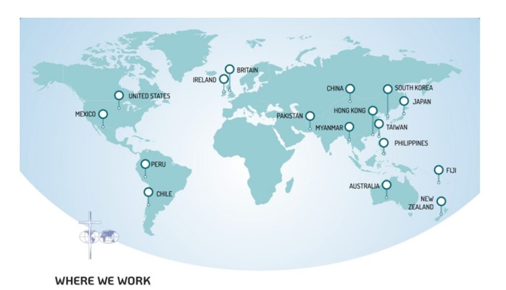 Today the Columban Priests and Lay Missionaries work in 15 countries: Australia, Britain, Chile, China, Fiji, Ireland, Japan, Korea, Myanmar, New Zealand, Pakistan, Peru, the Philippines, Taiwan, and the United States of America.