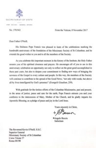 “With gratitude for the tireless efforts of the Columban Missionaries, past and present, in the areas of justice, peace and care for the earth, Pope Francis entrusts you and your confreres to the intercession of Mary, Mother of the Church, and he gladly imparts his Apostolic Blessing, as a pledge of peace and joy in the Lord Jesus.”