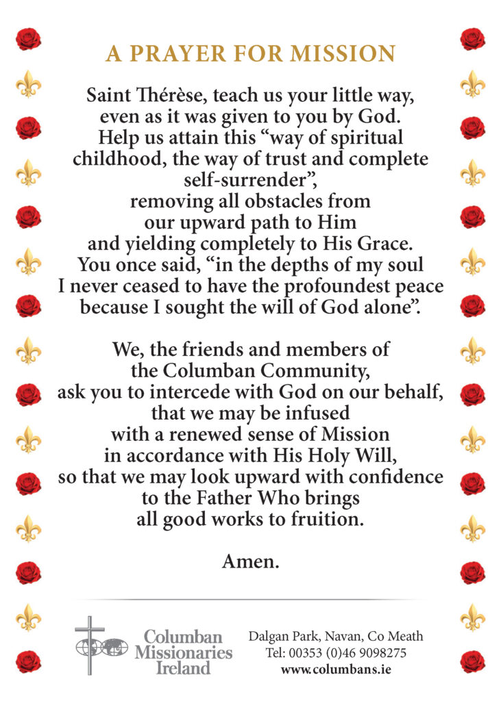 Our new prayer card invokes St Thérèse, Patroness of all Missionaries. She understood the need for peace and also the importance of mission.