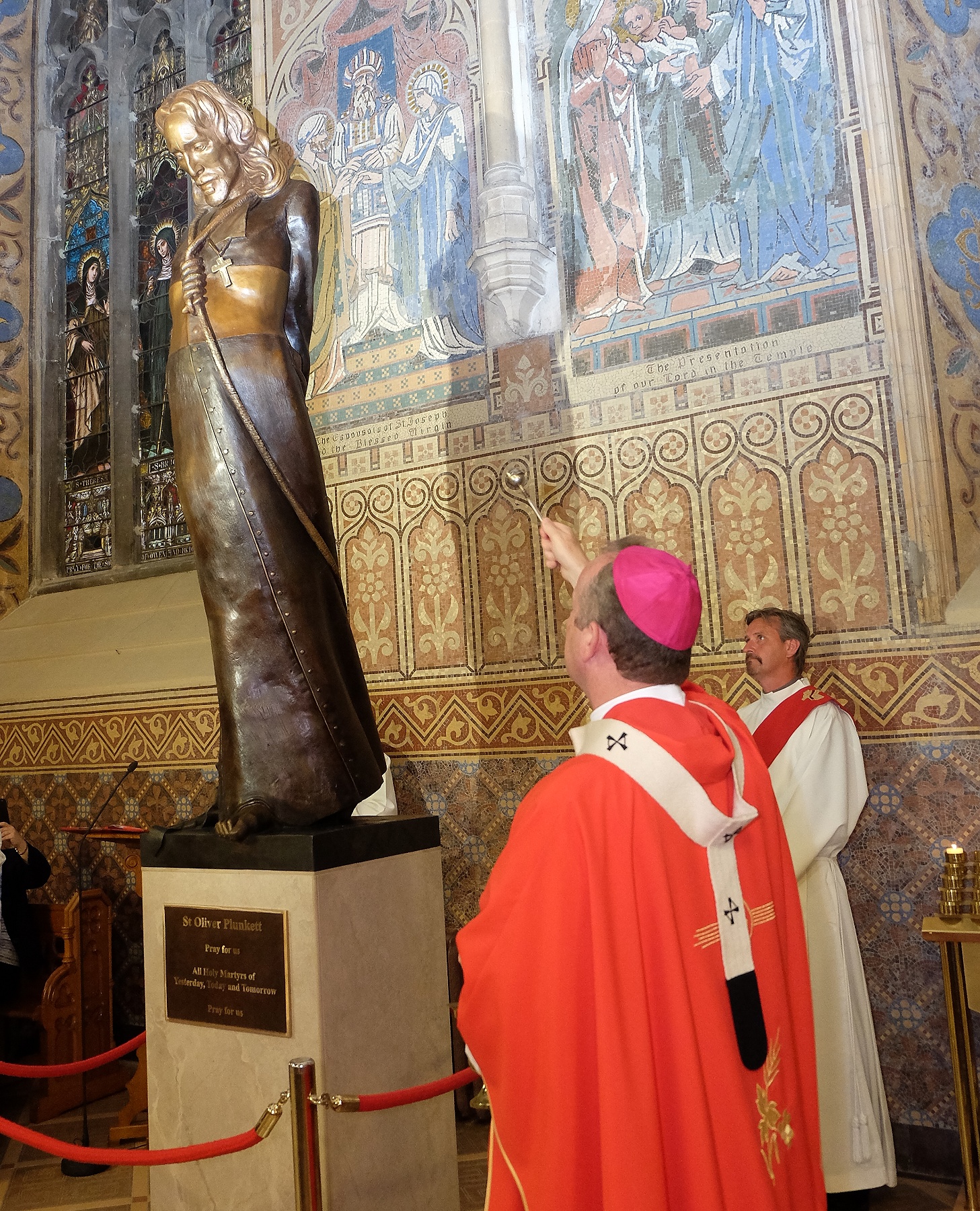 Archbishop Eamon Martin unveiling a bronze statue of St Oliver Plunkett in St Patrick Cathedral, Armagh in July 2019. Sculpted by Dony MacManus it depicts St Oliver at the moment of his martyrdom. It was commissioned as a memorial to all martyrs for the faith, past, present, and future. Photo: Liam McArdle
