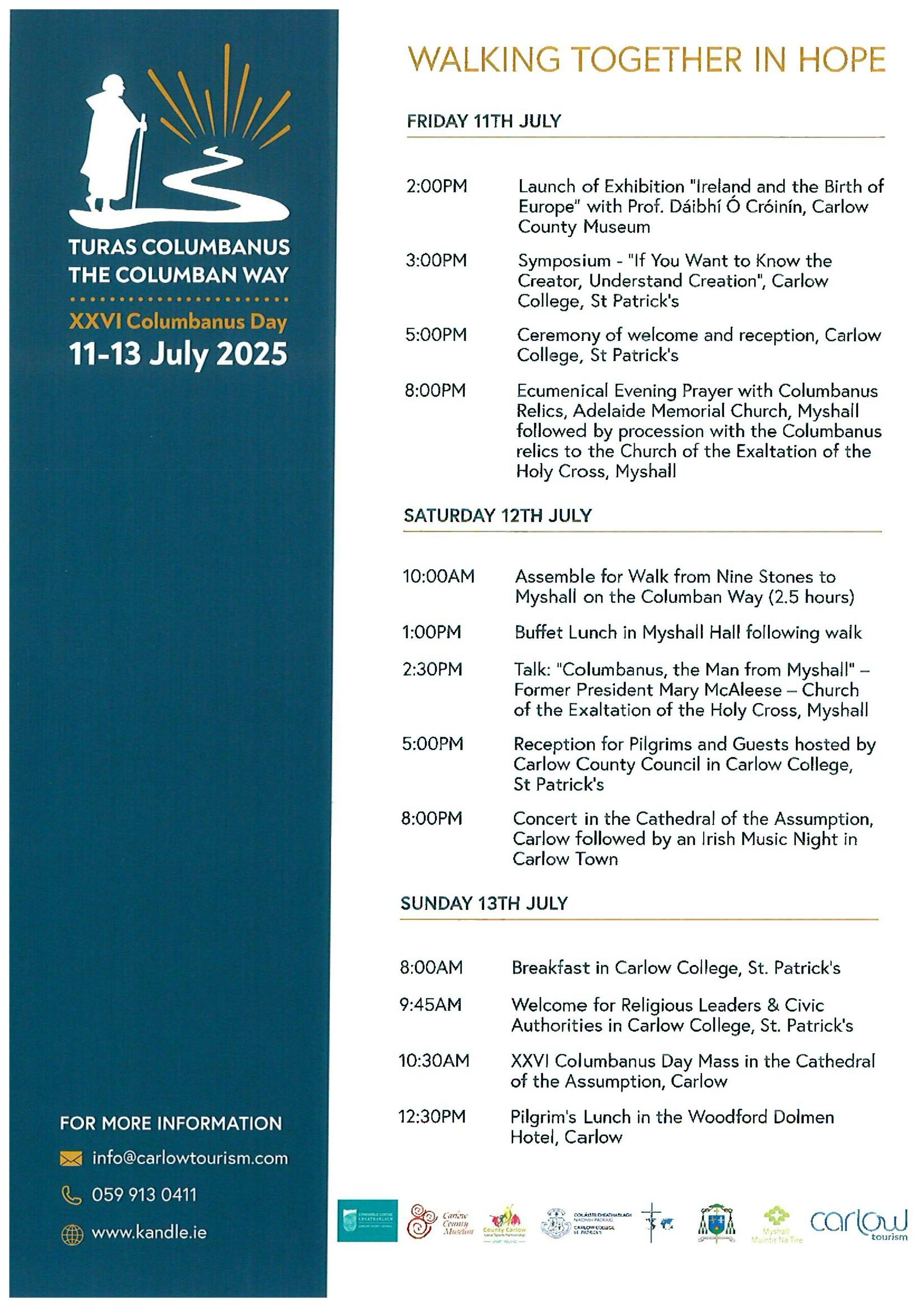 One key event of the July gathering is a public walk from Nine Stones into Myshall, starting from a monument dedicated to St Columbanus. The event is part of a wider celebration designed to deepen public understanding of the Saint and the route itself.